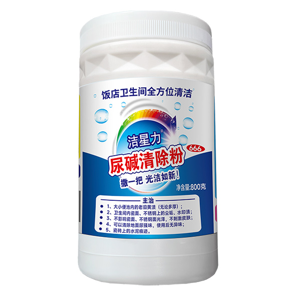 将尿渍洒水浸湿,把清洁粉均匀撒在污渍上面,浸泡5min后,用喷壶向污渍上均匀喷洒清水,再浸泡5min后用清水冲刷,即可干净。(较厚未清洗干净的污渍,二遍清洁浸泡的同时用马桶刷刷洗几下,然后用清水冲洗即可。)